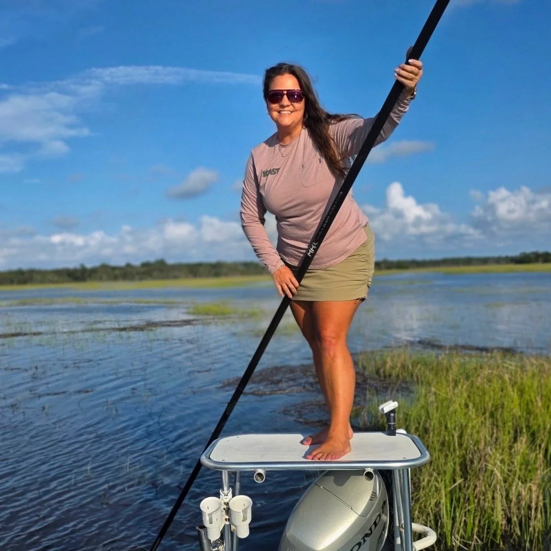 You’ll find her poling her 18-foot East Cape Lostmen across grass flats and backwaters, chasing tailing reds and creating the kind of memories that keep you coming back for more.